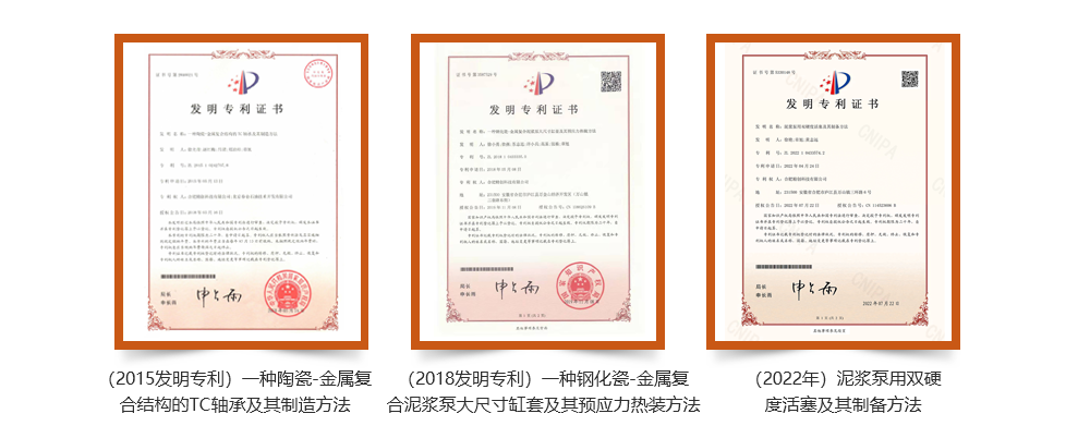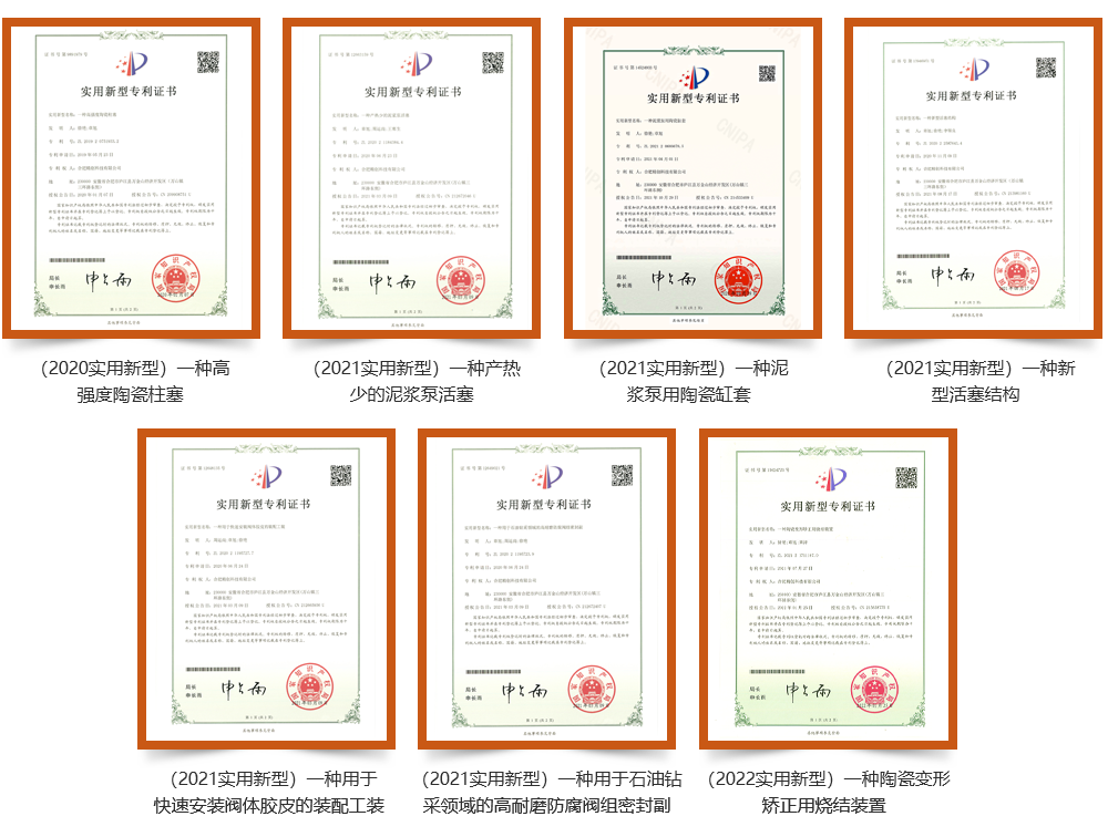 公司積極開展新材料、新技術、新產品的研發及應用,取得了多項卓有成效的合作成果。近年來研發團隊已授權專利32項,其中發明專利5 項。陶瓷結構件的兩個新產品研發分別獲得“中國創翼(2015)青年創業創新大賽”銀翼獎和“第四屆中國創新創業大賽”優秀企業獎,陶瓷缸套產品被授予“安徽工業精品”,“高壓泵用高強度高耐磨陶瓷基關鍵結構件研發及產業化”項目獲得省級科技進步三等獎。主持制定《柱塞泵用氧化物陶瓷柱塞》國家標準。